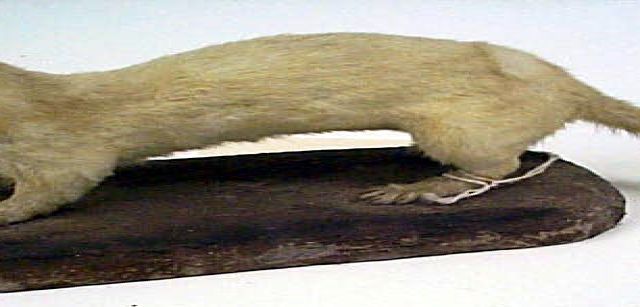Stoat in its winter white ermine, uncased mounted on a wooden stand.