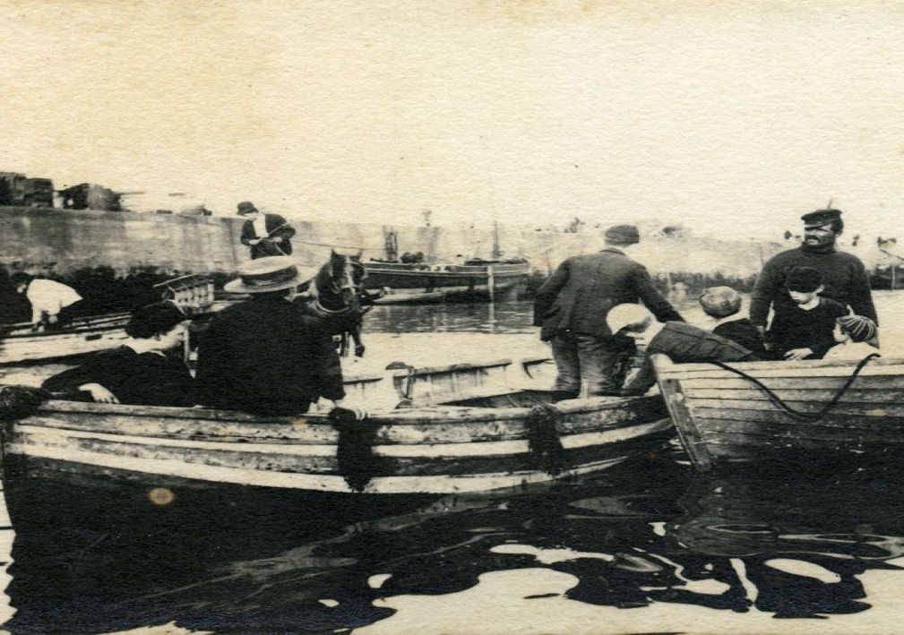 A quaint personal reminiscence of a family day out. A boy and a girl stand on the shingle at the edge of the sea, a small rowing dinghy within reach.