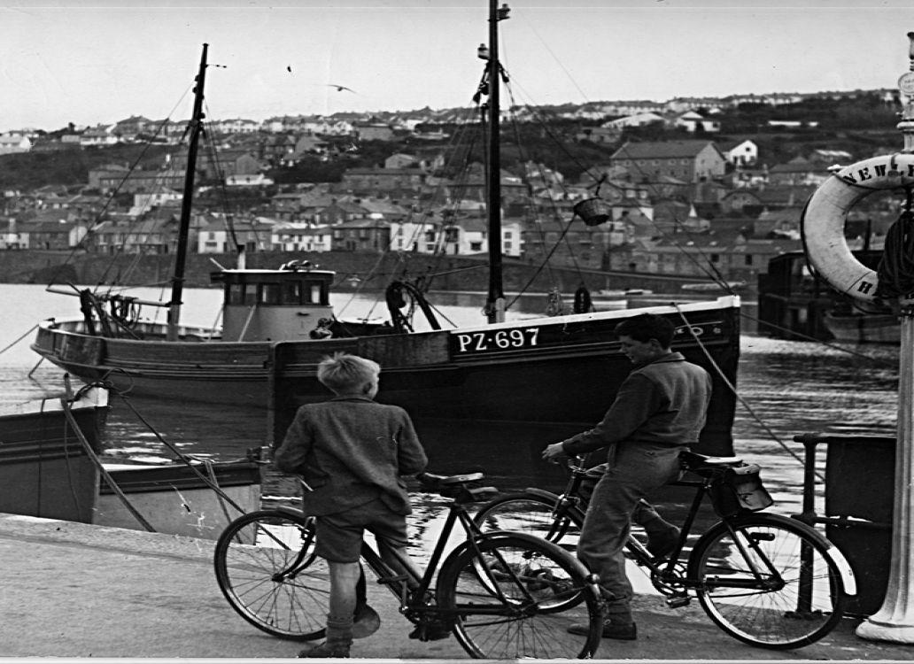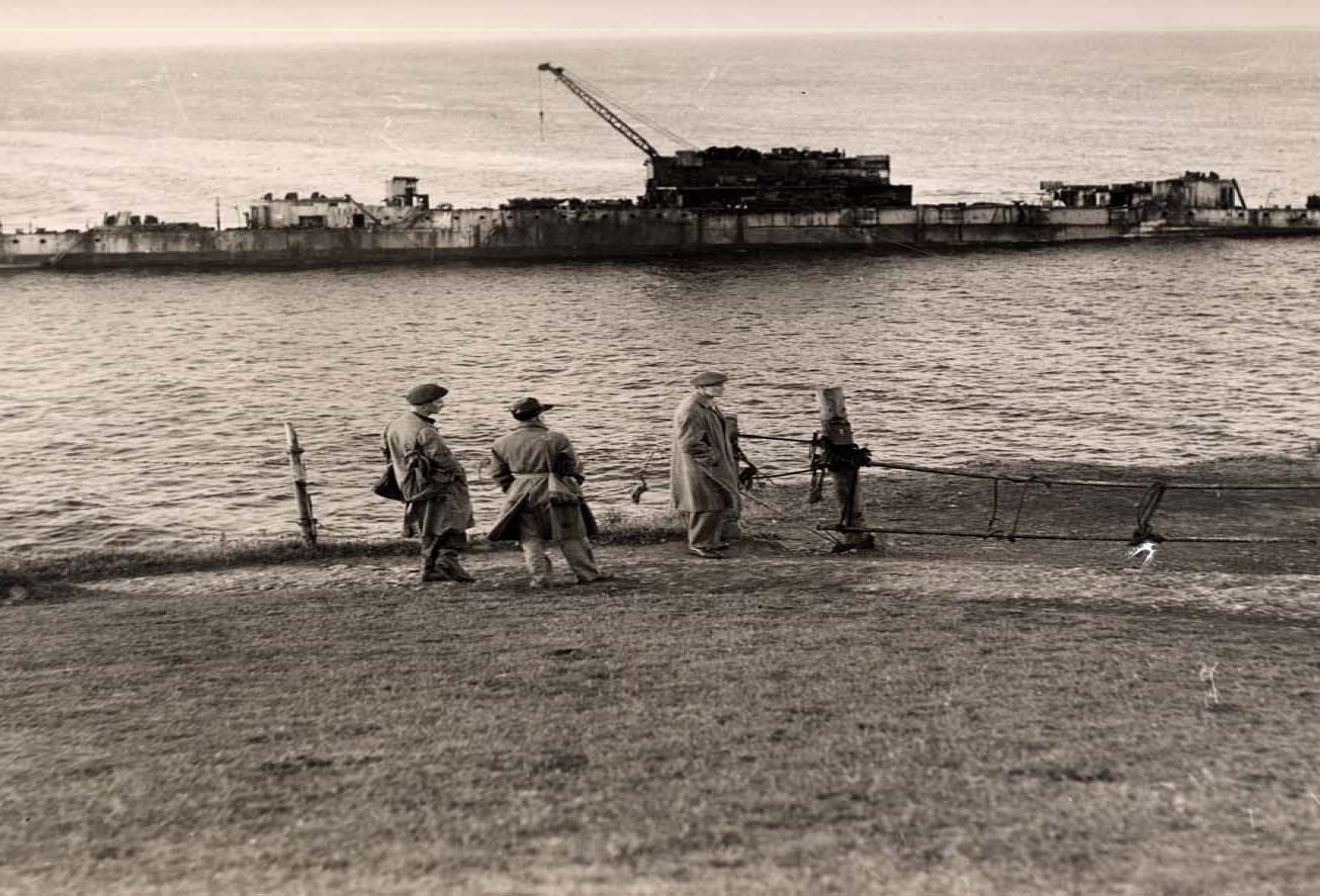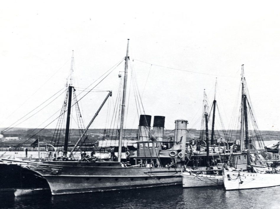 SS Lyonnesse and HMS Argus in Penzance Floating Dock with Seized French Crabbers.