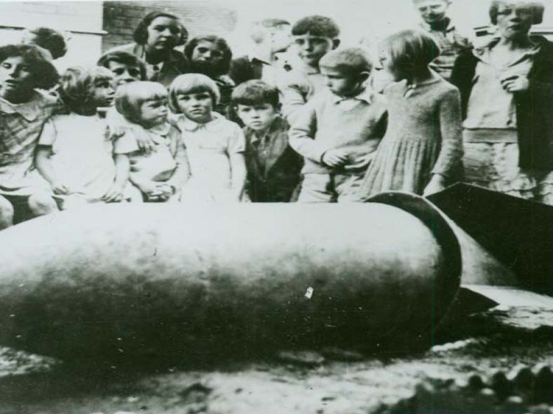 Penzance schoolchildren posing with a World War Two bomb near Tolver Place, Penzance