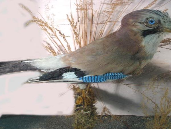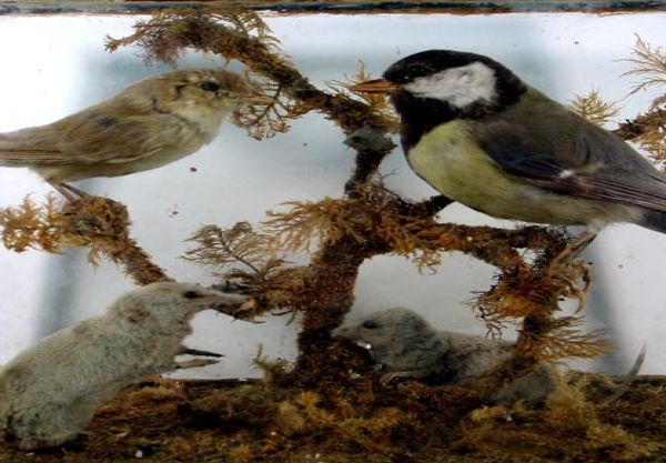 Great tit, in a case along with a willow warbler and two shrews.