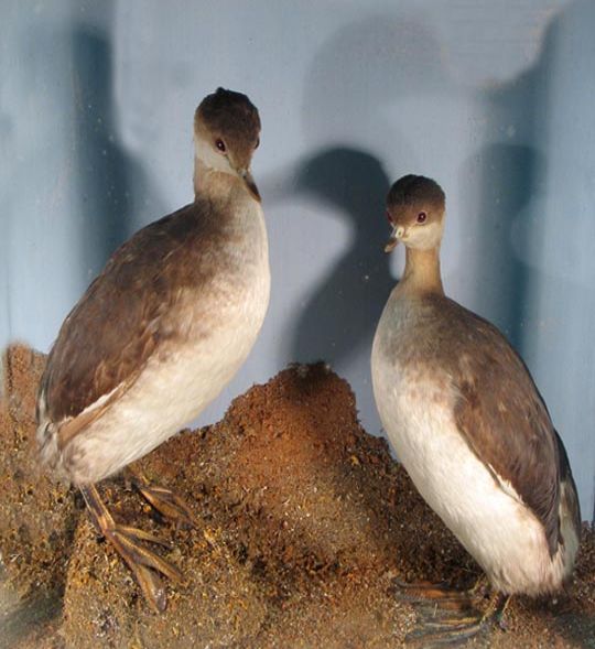 Male and female black-necked grebes in a case, mounted by W H Eva of Penzance.