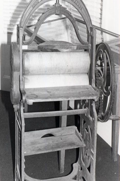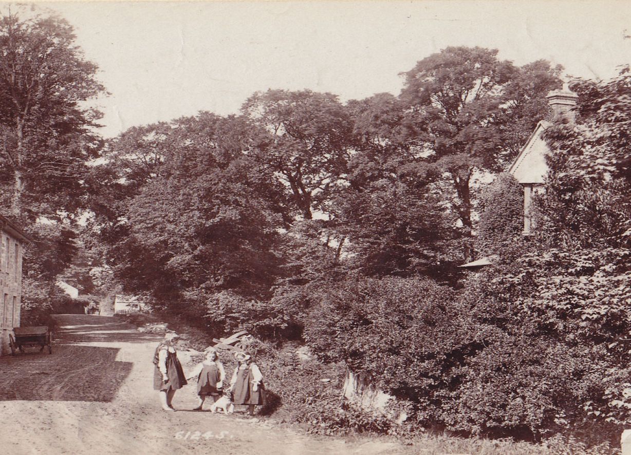 Two remarkably clean and well dressed boys with steel capped boots, one carrying a pair of shears, the other a rolled up fleece, look with distrust at the camera. A shearer is seated with a ram on a trestle in front of him. On the floor is a small pail of Stockolm Tar in case of cuts to the sheep. Piled on the clean cobbles of the farm yard is a stack of fleeces. The whole scene is composed with a sense of order and calm.