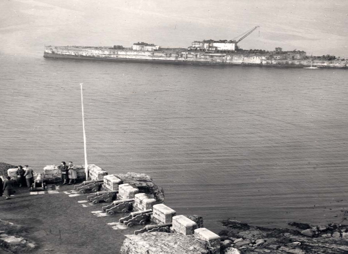 HMS Warspite being broken up as part of the salvage operation in Mounts Bay