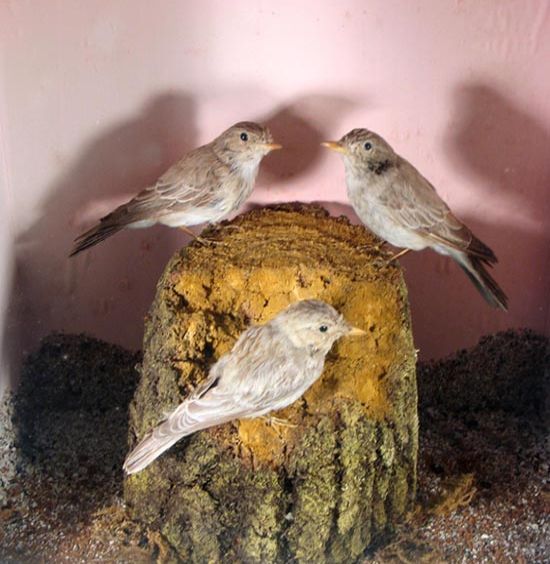 Three spotted flycatchers, mounted by W H Eva of Penzance.