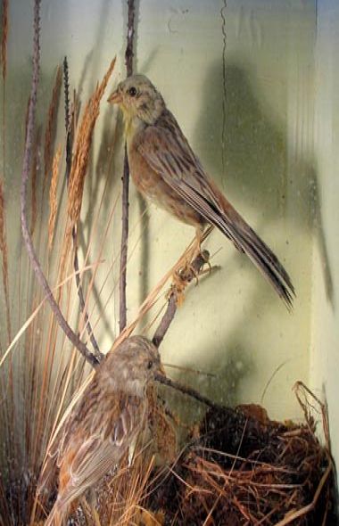 A pair of yellowhammers with a nest containing five eggs (one of which has fallen out of the nest). Mounted by W H Rowe of Heamoor, Penzance.