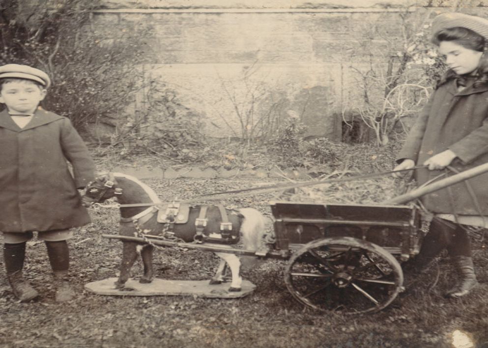 Richard and either Norah or Agatha Chirgwin pictured with toy pony and dead cart. Norah was born in 1896, Agatha in 1897 and Richard in 1901. Their father, Percy Chirgwin, ran a grocer's shop and cafe in Penzance. Agatha went on to be the first lady Mayor of Penzance.