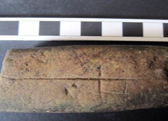 Medieval greenstone hone, with ground sides and grooved faces. One face has a cross-like indentation and the other side is dimpled with 40 small circular depressions. May have been used to sharpen hooks or needles, or used to push thick needles through leather or sails, circa AD 1200-AD1700.