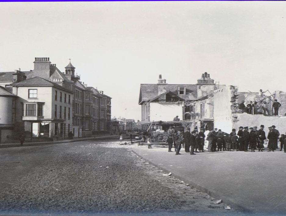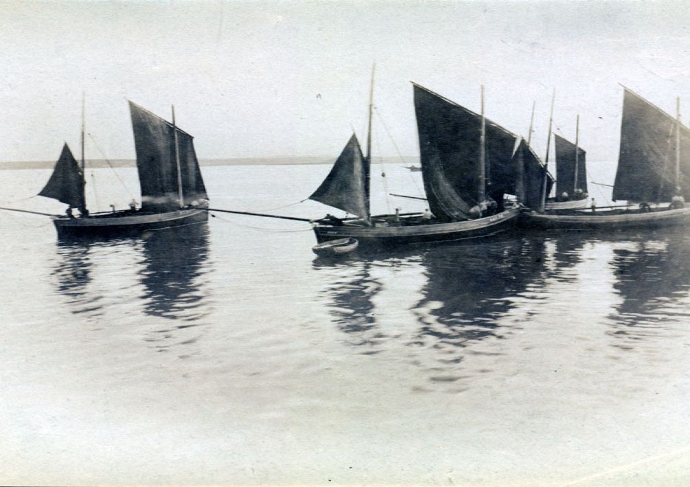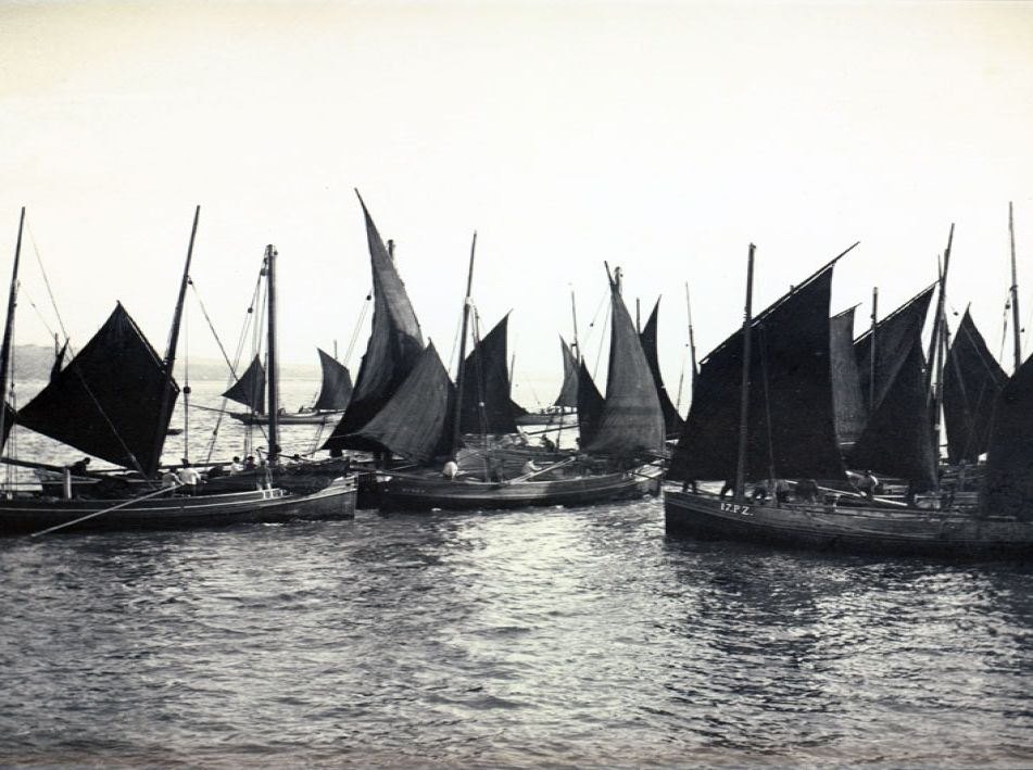 Mount's Bay, Penzance. Mackerel boats going to sea and a sailing vessel sailing in.