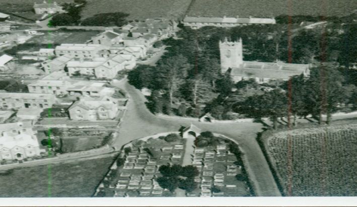 An aerial photograph of Gulval Church and village