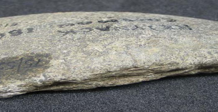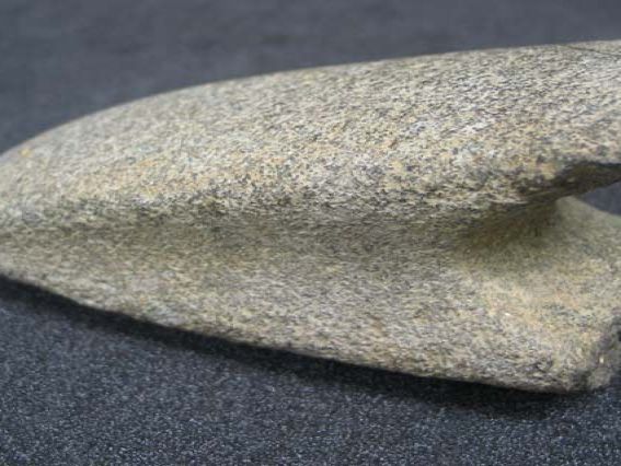 Butt end of possible greenstone adze found at Castle Gate, Ludgvan. Modern equivalent is a mattock.