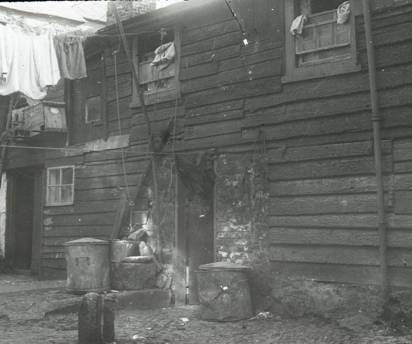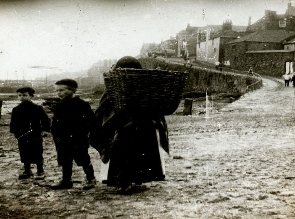 A fishwife with a cawl on her back talks with two boys at the bottom of Norard Slip