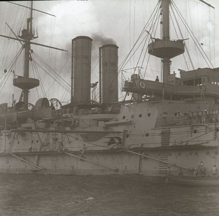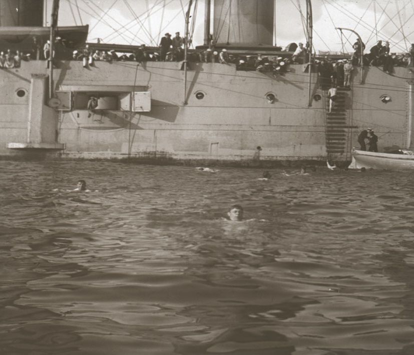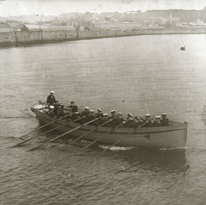 A steam picket boat delivers bread to the Fleet anchored in Mounts Bay in 1904