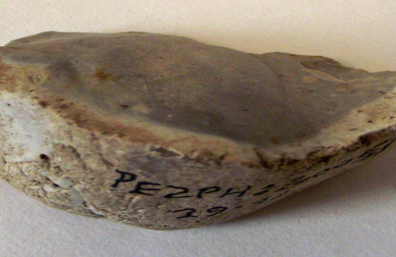 A natural rolled flint flake.
