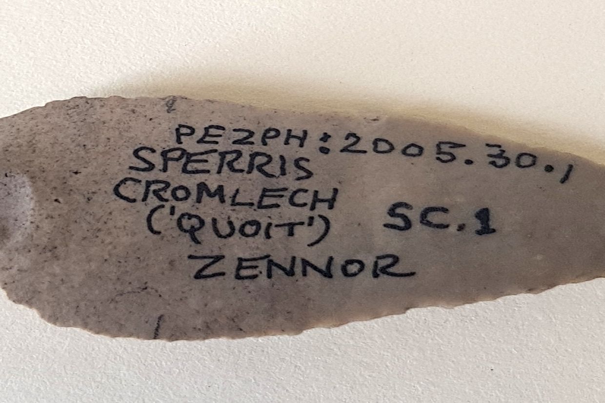 Retouched flint flake found below turf.