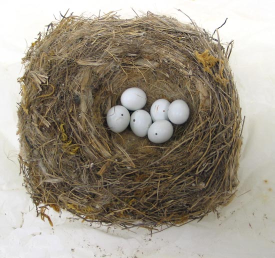 Description: Nest of Wheatear containing six light blue eggs, 12 mm in length. All have '18.5.13' written on them in pencil.