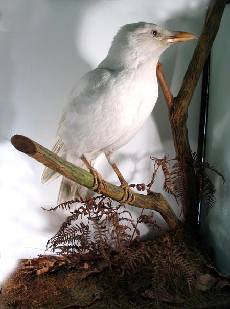 Description: Albino crow, mounted by Rowland Ward Ltd, London.