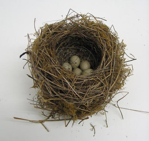 Description: Nest of sedge warbler with 5 green/grey speckled eggs, 10 mm in length. One egg has '13.5.13' written on it in pencil. Collected in 1913.