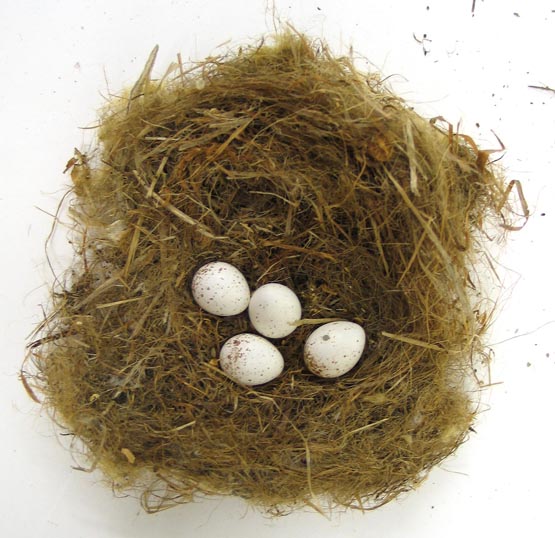 Description: Nest of marsh tit, made of grass and rabbit fur, with 4 eggs, though a note on file says that thre are only three.