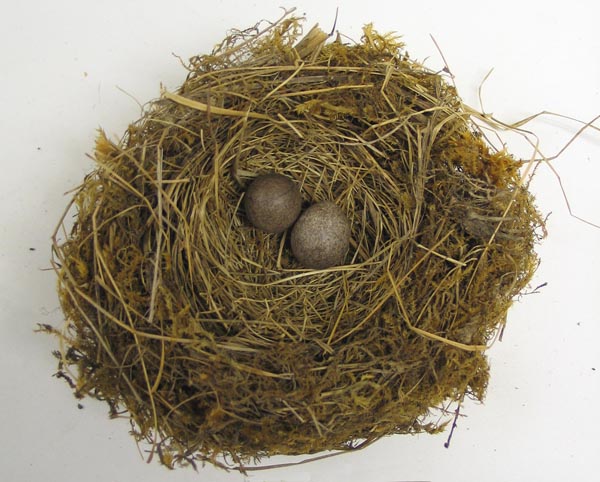 Description: Nest of tree pipit, with 2 brown eggs (1 missing). Collected in Bulford, Wiltshire on 26 May 1913.