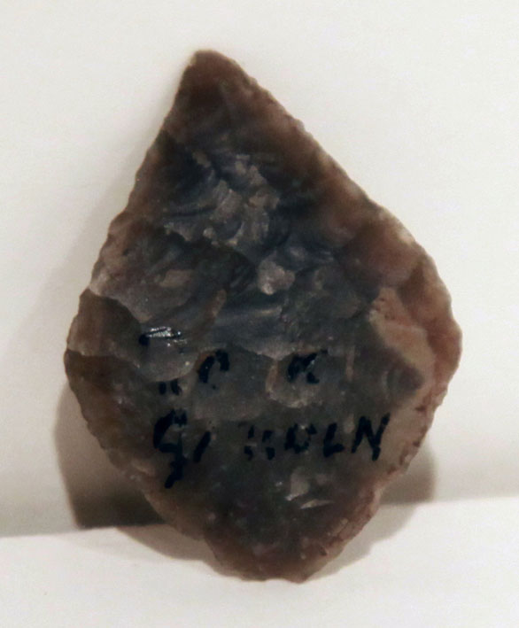 Description: Leaf-shaped Neolithic flint arrowhead found at Raftra Farm, St Levan.