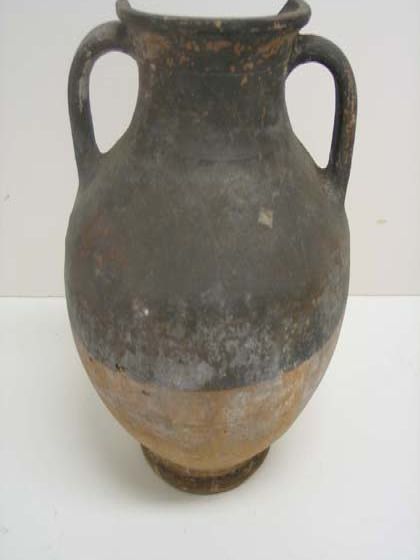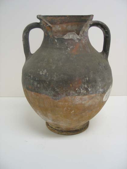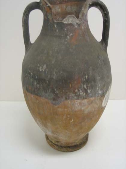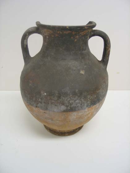 Description: Red earthenware pot, with some form of dark colouring on the top half