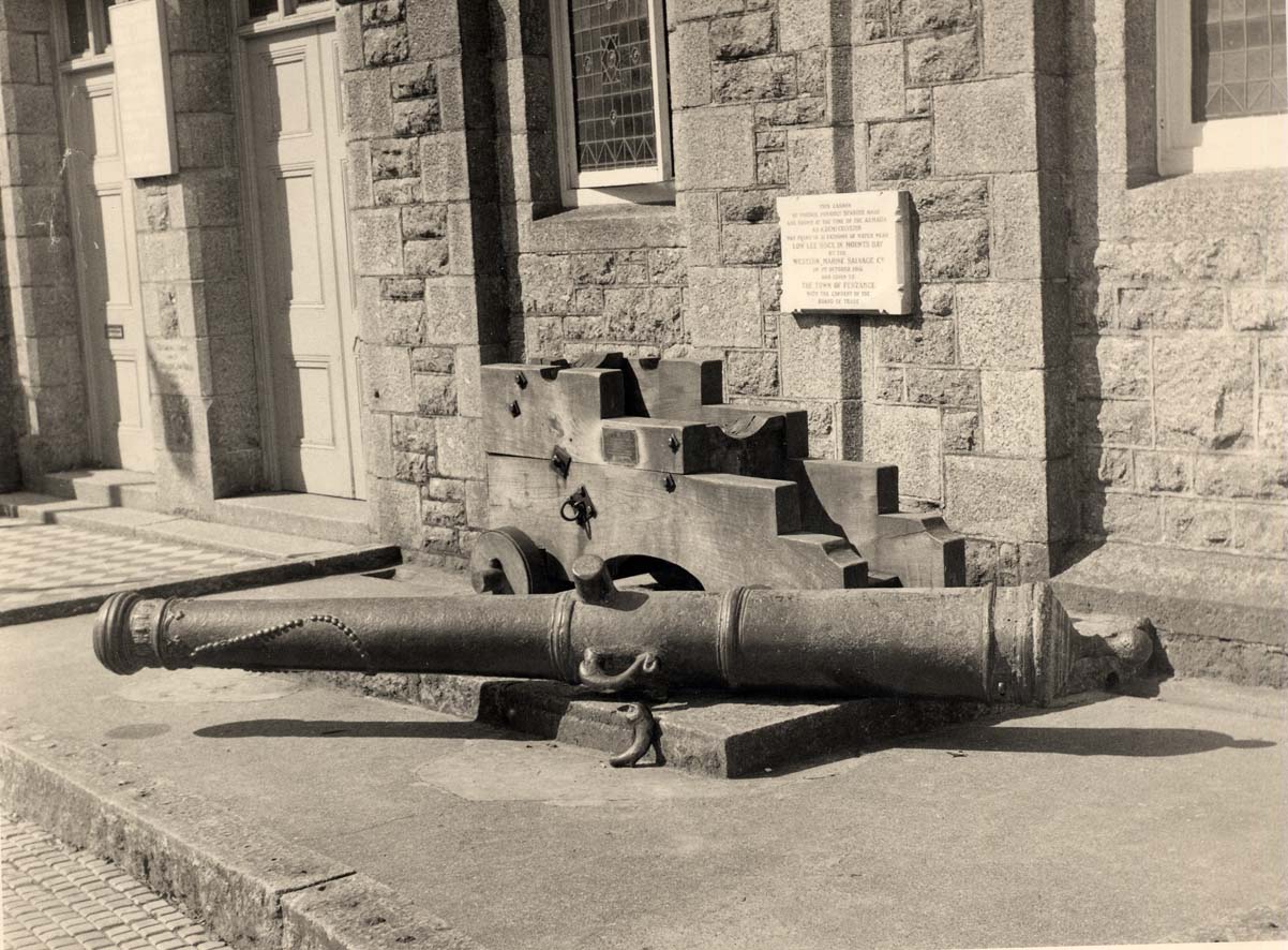 Description: This close up is one of a series of photographs taken by Harry Penhaul to record the setting of this local memorial outside the Public Library in Morrab Road in 1953. The dolphin feature of the handle is interesting. The cannon is a demi-culven found near Low Lee Rock on 30 October 1916. The handle is in the form of a dolphin. The cannon was stolen in the 1990s.