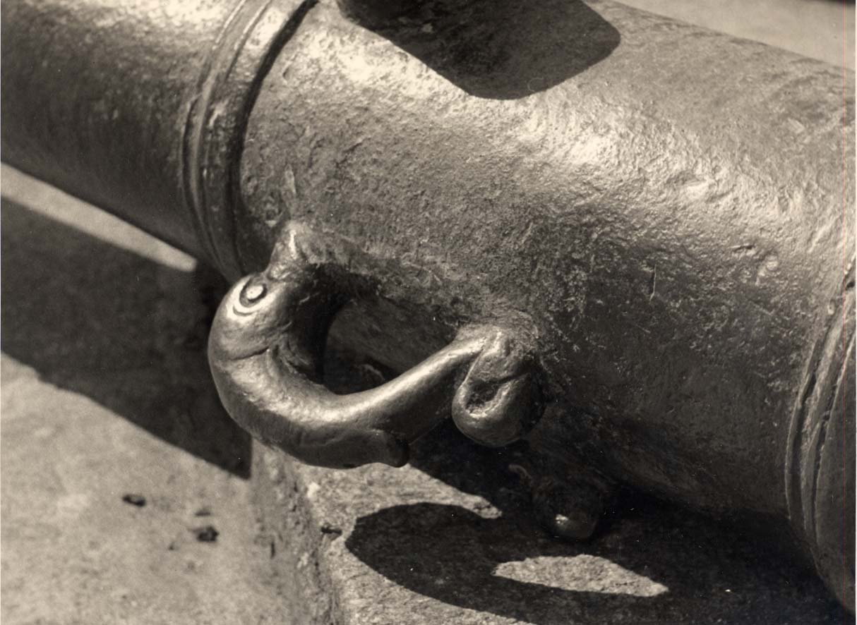 Description: This close up is one of a series of photographs taken by Harry Penhaul to record the setting of this local memorial outside the Public Library in Morrab Road in 1953. The dolphin feature of the handle is interesting. The cannon is a demi-culven found near Low Lee Rock on 30 October 1916. The handle is in the form of a dolphin. The cannon was stolen in the 1990s.