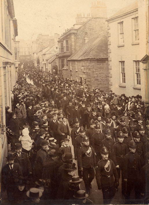 Description: This is the procession en route to St Mary’s Church, Penzance for a memorial service for Queen Victoria on 2 February 1901. The 640 in the procession comprised 100 Royal Navy Reserves; 5 Coastguards; 80 Artillery Volunteers; Sergeants at Mace; Borough officials; The Justice, P Pearce Couch; the Mayor; The Mayor’s Chaplain the Reverend W A Laburn, Deputy Town Clerk, J B Cornish; Borough Treasurer R F Bolitho; Clerk of the Peace, J Penn Milton; 7 magistrates; army officer’ naval officer; 9 Ministers of religion; members of the corporation; officials; Freemason; Oddfellows; Foresters; Rechabites.