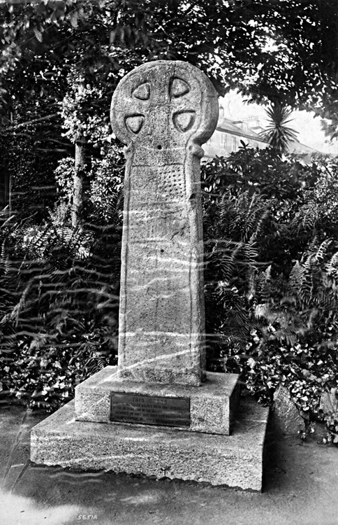 Description: The town cross in situ in the Morrab Gardens prior to being moved to Penlee House at a cost of £15. Ht 2.07m, wd 0.64m, dth 0.24m. Was first recorded at the Grenmarket; in 1829 it was moved to a location in Causeway head. Was moved to Morrab Gardens in 1899. £15 was charged to then move the cross to Penlee.