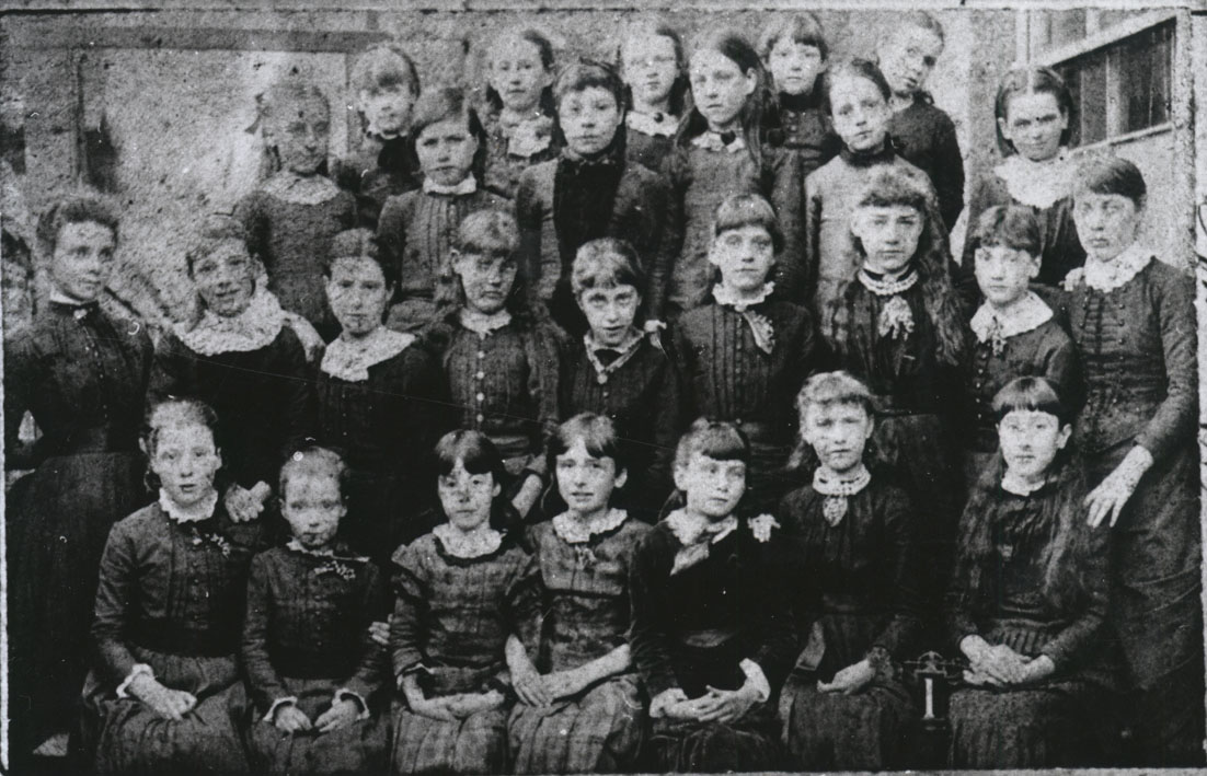 Description: This is a formal photograph of a group of 26 healthy looking, well dressed young ladies,with possibly 2 teachers, the front row being seated. The age range of the girls is possibly seven to thirteen. The era could be Victorian or Edwardian. They all sport lace collars, some lace cuffs. These were detachable for laundering to save washing the whole dress. They all seem to have long hair which is clean, shiny and pulled off the face. The older ladies are obviously wearing whale bone corsets. Any help in identifying the location and people in this shot would be very welcome by the Museum.