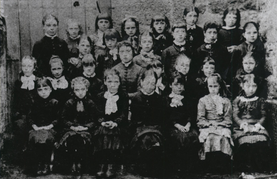 Description: This is a group of 28 healthy looking and well dressed girls, possibly aged from seven to eleven, half of whom are seated. What appears to be a serious faced lady sits at the front with an older girl on the left at the back. It could be a school or a Sunday school group. There were several such establishments in Penzance at the turn of the 20th century. The length of the girls' skirts would indicate an Edwardian era but the lace scarves are rather Victorian. Any help in identifying this group and its location would be most welcome by the Museum.