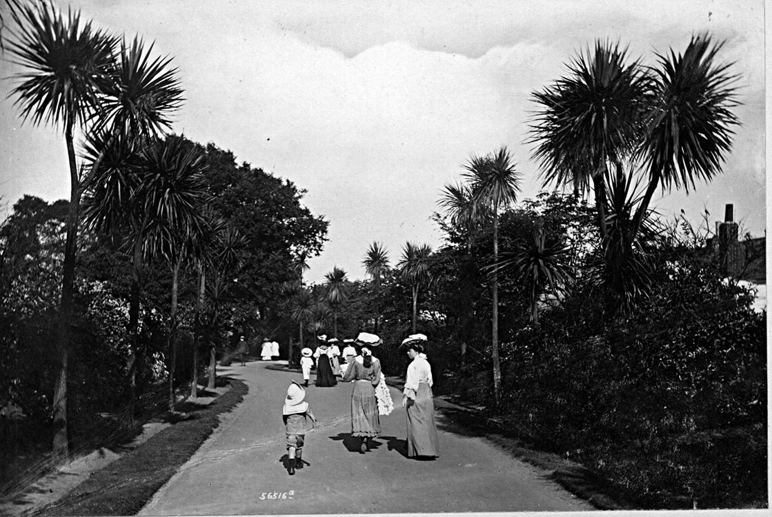 Item: Edwardians stroll down the avenue of palms in the sunshine of the Morrab Gardens