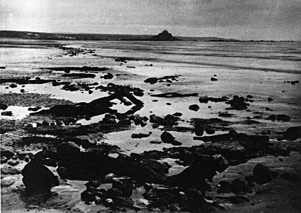 Description: With St Michael's Mount and the Lizard in the background, this is a view of the remnants of the submerged forest in Mounts Bay, exposed during a Spring tide in 1890. The old name for St Michael's Mount was 'The Grey Rock in the Wood.'