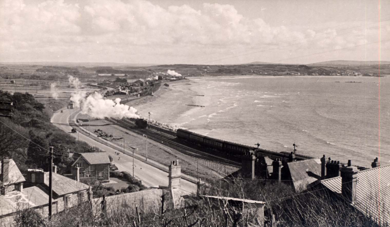Description: A view of Chyandour taken from the lane above the old barracks. To the left of centre the coaling stage and engine sheds lie near the sea. The tall goods shed is behind the flat-roofed Ponsandane signal box. The house in the foreground is Ponsandane Lodge and this faces the home of Mrs Furse, the retired Ponsandane housekeeper. Behind this is the Bolitho Estate Office in the middle of bottom of the picture. Chyandour Barracks is in the bottom right hand of the picture behind the ridge roof of the County Police Station. In the middle of the picture can be seen two pipes in the sea which were for land drainage.