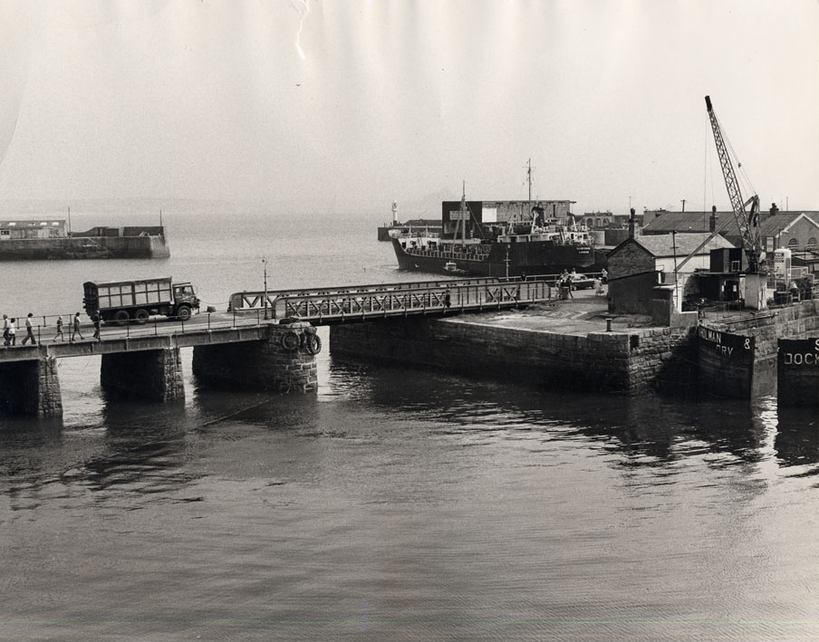 Description: A Bedford lorry makes its way towards the Ross Bridge. In the background lies Rank's store, to the right, the old Smithy as viewed from Abbey Slip. A diesel coaster lies alongside the outer awl of the North arm of the floating dock.
