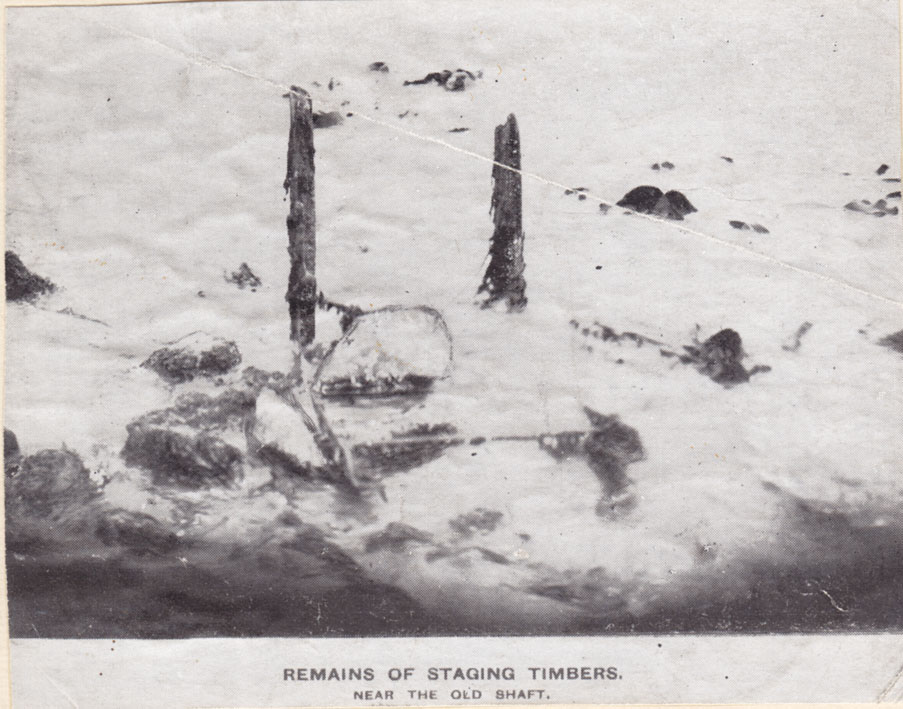 Description: This is the remains of staging timbers near the old shaft of Wherry Town Mine. Built in 1778 by Thomas Curtis of Breage, the mine shaft was protected by a stone breakwater. Thomas Gundry erected a steam engine on shore to facilitate lifting of the ore from the mine workings. Operations ceased in 1798 when an American vessel anchored in the bay, broke its moorings and crashed into and demolished the head gear. It re-opened in the 1830s but closed again in 1840.