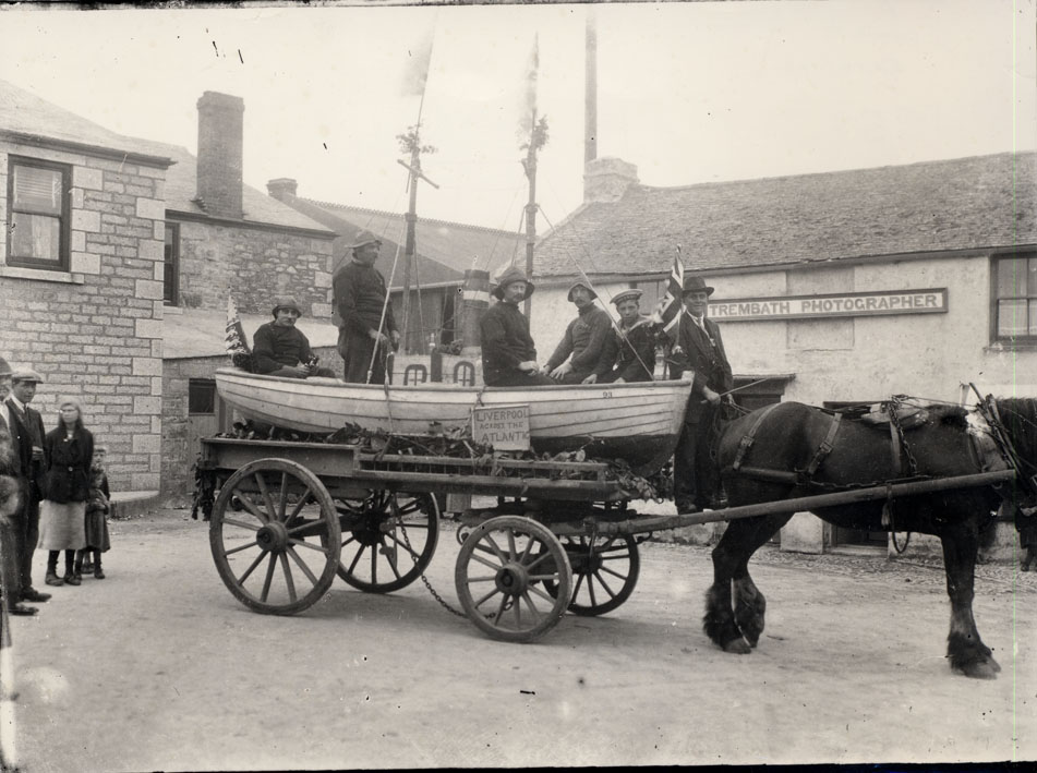Description: A horse-drawn carnival float with a boat and crew apparently crossing the Atlantic from Liverpool, in Banks Square, St Just.