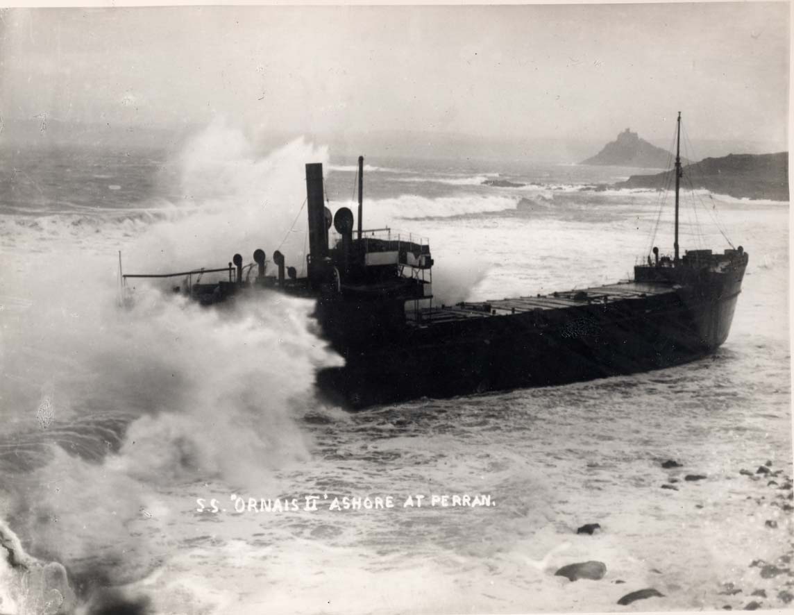 Description: The French steam ship SS Ornais II, built at Bordeaux in 1920, ran aground on Trebarvah Beach, Perranuthnoe on 5, 6 or 7 December 1929. This postcard shows waves breaking over the wreck. She was on passage from Le Havre to Port Talbot for coal. All her crew survived; the wreck broke up on the beach. St Michael's Mount is in the background.