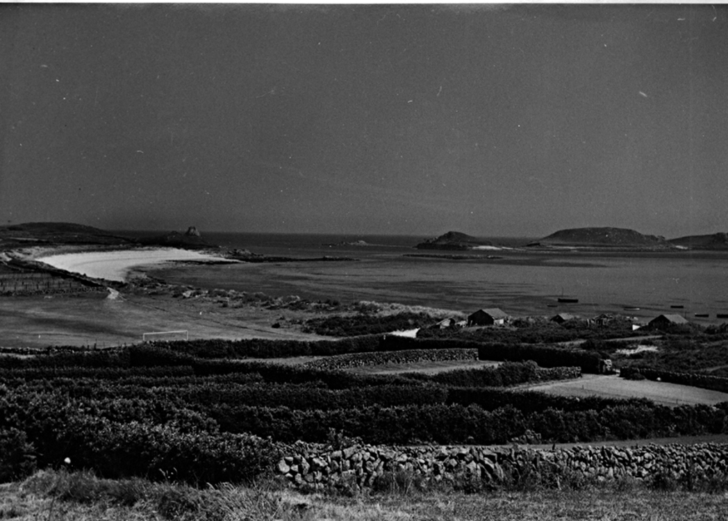 Description: On the eastern side of the island, this is a view from the top of Signal Row. The hedges around small fields provide shelter for early crops such as flowers and potatoes. In Roman times the islands were a single island known as En Noer, The Land. In 2011, S Martin's is thriving with fishing, farming, market gardening and a reputation for good food and hospitality.