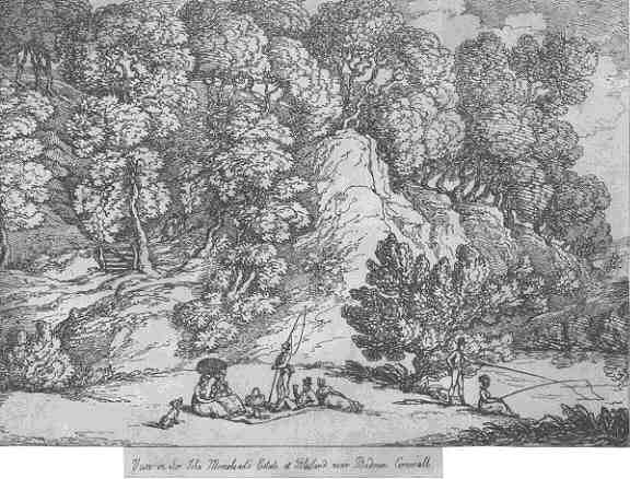 Description: Group picnicking at bottom of rocky crag in woods, two ladies under parasols, another fishing in pond with man.