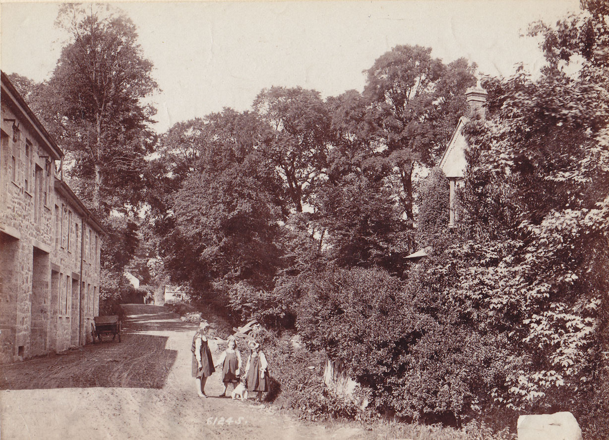 Description: Three schoolgirls stand in the road; if the image on the left is a car, possibly it would date the picture to the 1920s. There is a bridge to St Peter's Church on the right which was built in 1866 before which time Newlyn was part of Paul parish.
