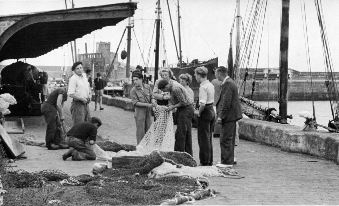 Description: Fishermen are working on a trawl whilst interested onlookers stand by. Their French crabber is moored to the right on North Pier whilst there is a stone boat to the South Pier.