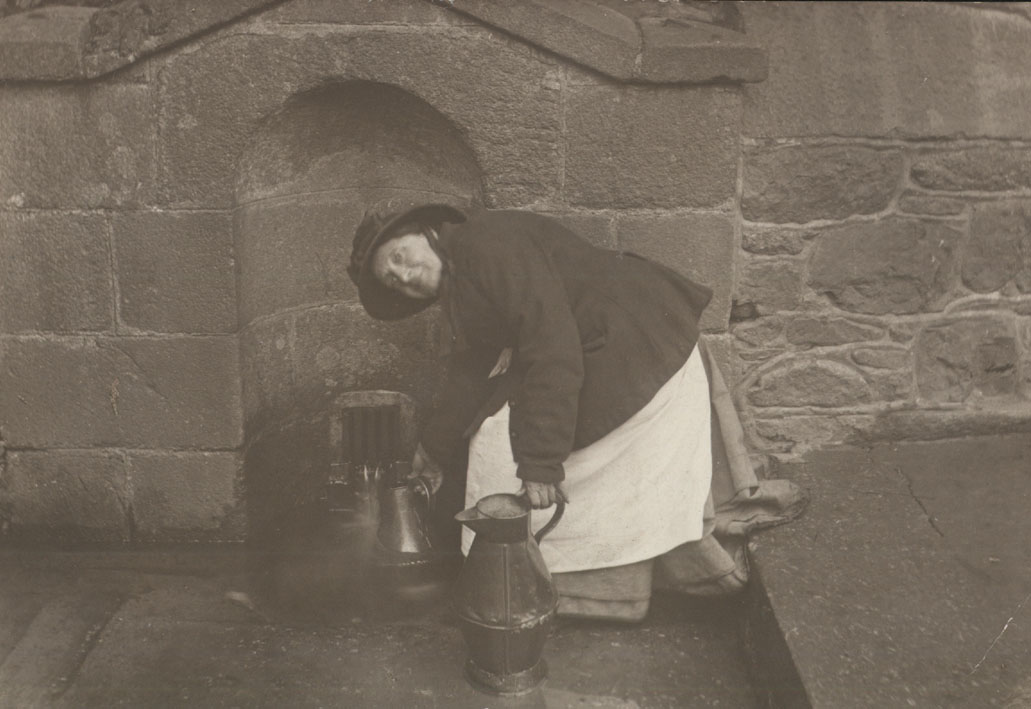 Description: This chute can be seen at Well Fields on the footpath between the Public Library and Hawkins Road. Phyllis Rowe's job was to collect water for domestic use, initially for those unwilling or unable to get to their nearest water source. After the installation of a piped water supply to large parts of Penzance, Phyllis still ha a job delivering to those households which preferred water from a chute. She is said to have charged 2d a pitcher. During hot, dry spells, the water carriers often had to wait half an hour to fill their pitchers from the less than gushing springs.