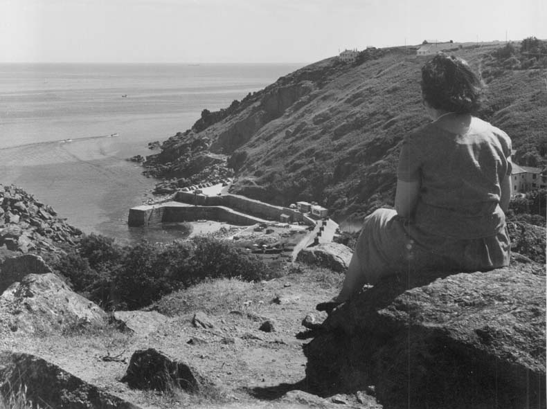 Description: A lady sits above Lamorna Cove. Near the top of the hill is the huer's hut and below is the shop that the late John Daniels built. It is likely that the photograph was taken for inclusion in the Penzance Tourist guide.