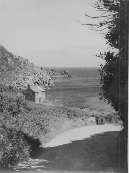Description: The only road into Lamorna Cove with the house below the quarry on the left. It is likely that the photograph was taken for inclusion in the Penzance Tourist guide.