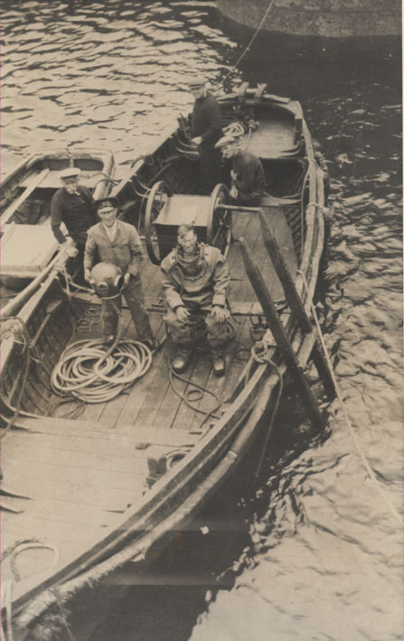 Description: Omar Pascoe, diver, with his support team pose for the camera in their diving boat moored between the dock gate bastions.