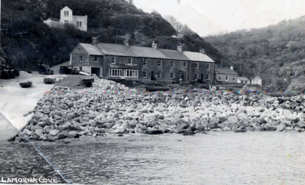 Description: The row of cottages at Lamorna Cove before 1983. The building on the left was the magazine housing the dynamite for the quarry.