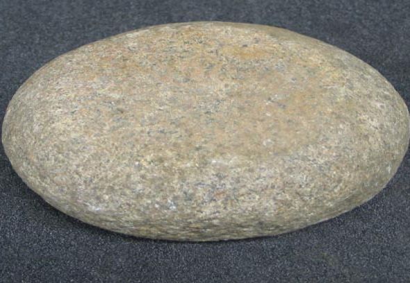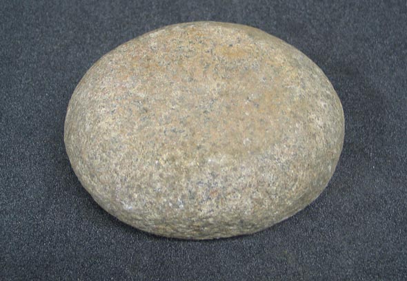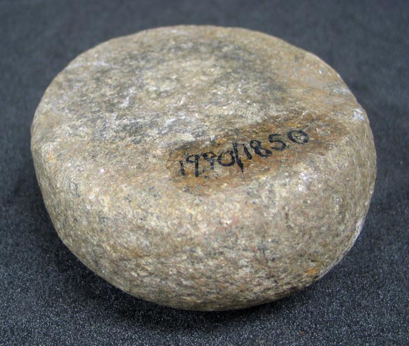 Description: Large bun-shaped stone, worked all over to shape. Two main surfaces ground smooth, one showing traces of use.