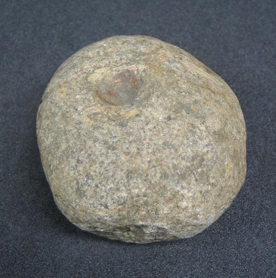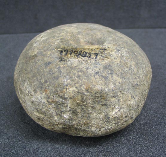 Description: Round stone with two deep indentations, which do not quite go all the way through to form holes. Possibly an unfinished mace head.